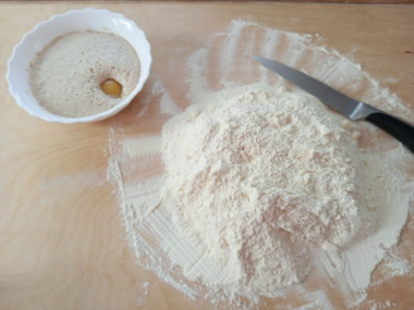 На стол высыпьте 550 г муки. В муку всыпьте соль, добавьте нарезанное кубиками холодное сливочное масло и порубите ножом в мелкую крошку.