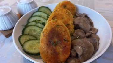 Была картошка простая, а стала - золотая... Это картофельные котлеты из пюре на сковороде с хрустящей корочкой и нежные внутри. В котлеты, добавила немного жареного лука, копчёную паприку, молотый перец и зелень. Подавала с маринованными маслятами и свежим огурцом.