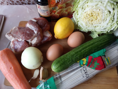 Как сварить корейский суп с лапшой? Подготовьте необходимые ингредиенты. Мясо лучше использовать нежирное, хорошо подойдёт вырезка из свиной шеи. Вместо огурца смело можно взять редис, а проросшие ростки сои заменить на пекинскую капусту. Лапша для этого супа подойдёт пшеничная, яичная или рисовая. Свинину можно заменить на мякоть говядины.