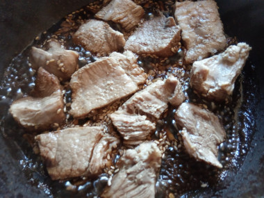 Далее добавьте в сковороду пропущенный через пресс чеснок, соль(примерно 0,5 ч.л.) и сахар. Следом влейте соевый соус и хорошо всё перемешайте. По желанию можно добавить щепотку молотого имбиря, тогда мясо и соус получатся ещё пикантнее.