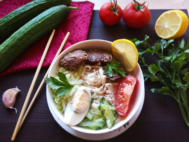 Осталось самое интересное - собрать суп. Количество каждого ингредиента регулируйте на свой вкус. На дно глубокой тарелки выложите лапшу, сверху кусочки ароматного мяса, ростки сои, свежий огурец, зелёный лук и яйцо. Залейте всё аккуратно горячим бульоном. Сбрызните суп соком лайма или лимона и посыпьте молотым перцем чили. Если остался соус после тушения мяса, то его также можно добавить по вкусу. Сразу подавайте суп к столу. Приятного аппетита!