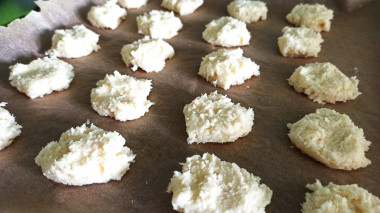 Включите духовку на разогрев (180 градусов). Противень застелите пергаментом. С помощью ложки разложите тесто небольшими порциями.