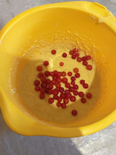 Всыпать ягоды в тесто и аккуратно перемешать лопаткой, чтобы не подавить ягоды и они равномерно распределились по всему тесту.