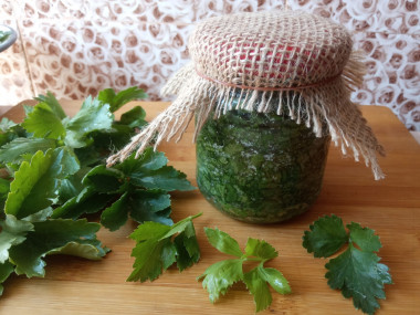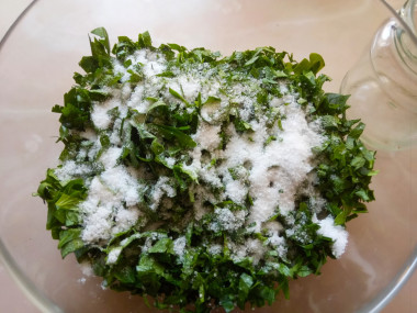 При сухом посоле промытая зелень мелко рубится и смешивается с поваренной солью, плотно укладывается в стеклянные баночки. Хранится такая заготовка в холодильнике. Она получается очень соленой, ее можно добавлять в блюда вместо соли, получается не только соленое блюдо, но и пряное, ароматное.