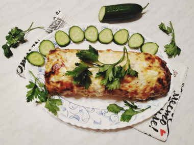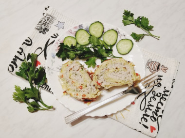 Картофельный рулет с фаршем подавайте в теплом виде с овощами и зеленью. Приятного аппетита!