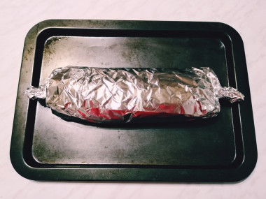Переложите рулет на фольгу и заверните его в виде "конфетки". Запекайте рулет при 180 С примерно 25 минут. При этом снова ориентируйтесь на работу своей техники. О нюансах использования фольги читайте в статье по ссылке в конце рецепта.