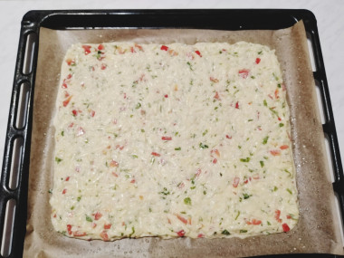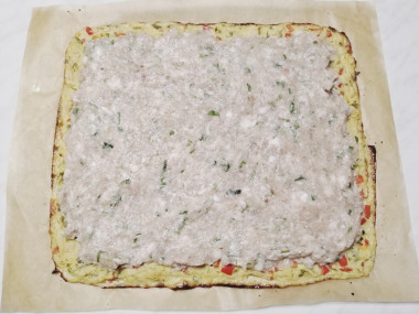 Противень застелите пергаментом, который дополнительно смажьте растительным маслом. Используйте качественный, лучше силиконизированный, пергамент, чтобы готовый пласт было легче свернуть. Информацию о выборе пергамента читайте в конце рецепта. Картофельную массу распределите на пергамент ровным слоем и выпекайте в разогретой до 180 С духовке.