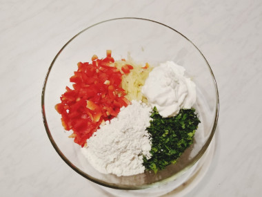 К тертому картофелю добавьте яйца, болгарский перец, зелень, сметану и муку. Картофельную массу посолите и хорошо перемешайте. Включите духовку разогреваться на 180 С.