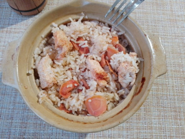 Горшочки заполнить рисом с курицей примерно на половину или чуть больше, так как рис по мере готовности будет разбухать и ему нужно место.