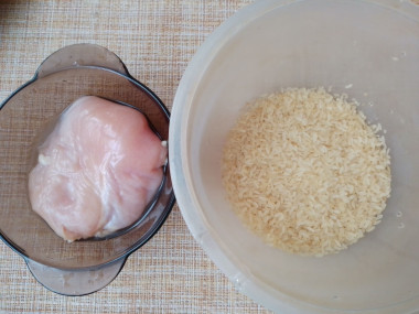 Подготовить ингредиенты. Для приготовления риса с курицей в горшочке нам понадобится: куриное филе; рис; морковь; лавровый лист; карри; черный молотый перец и соль.