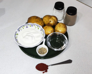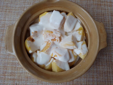 Готовится это блюдо очень просто! Картошку почистила, промыла, порезала на крупные кусочки, уложила в горшочек до середины, присолила, залила сметаной разведённой с водой. И так повторила еще раз. Из специй добавила только немного паприки. Захотелось максимально натурального вкуса.