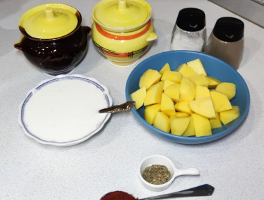Как сделать картошку в сметане в горшочках? В этом рецепте нет ничего сложного. Для начала подготовьте необходимые ингредиенты по списку. Сметана подойдет любой жирности. Помимо указанных специй можете добавить свои по вкусу.