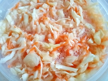 Посуда у меня широкая, поэтому сначала положила небольшой пресс. На вторые сутки при комнатной температуре капуста "закипела". С этого момента как можно чаще протыкала ее деревянной палочкой для выхода газа. У меня капуста бродила двое суток, на кухне было очень тепло. Как только процесс остановился, убрала ёмкости в холодильник.