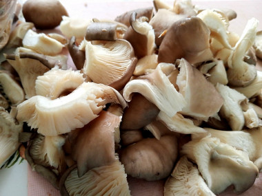 Как пожарить вешенки? Хорошо промойте их, дайте стечь воде, срежьте загрязненные и поврежденные места. Нарежьте грибы небольшими кусочками. На другой сковородке разогрейте оставшиеся 2 ст.л. растительного масла. Выложите грибы. Обжаривайте их на достаточно большом огне, часто перемешивая, до испарения выделившегося сока. Грибы должны слегка подрумяниться. Вы можете жарить грибы на той же сковороде, что и картошку, предварительно переложив ее в миску.