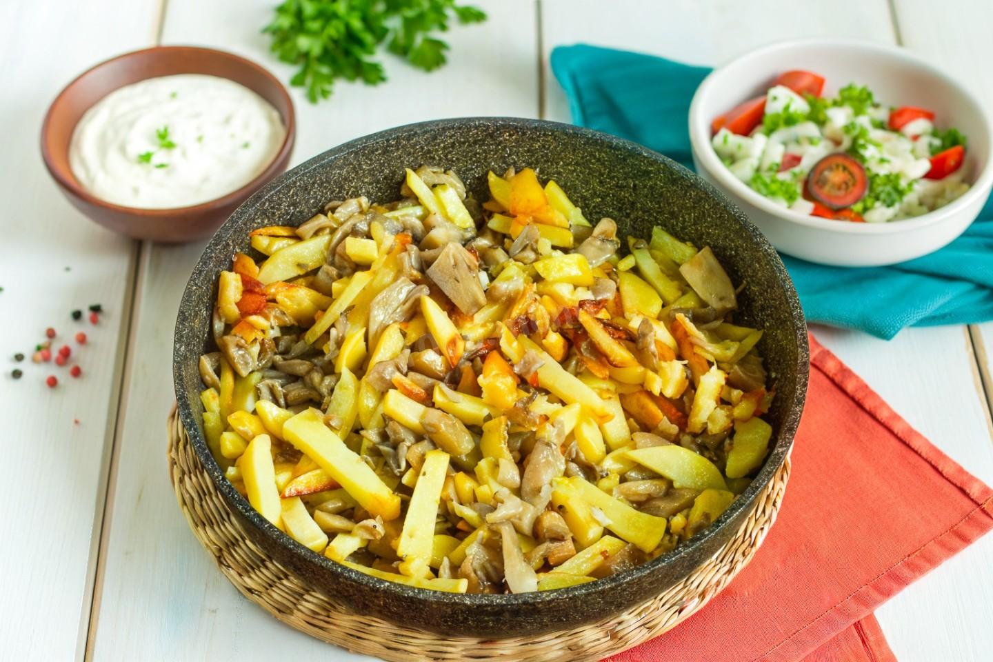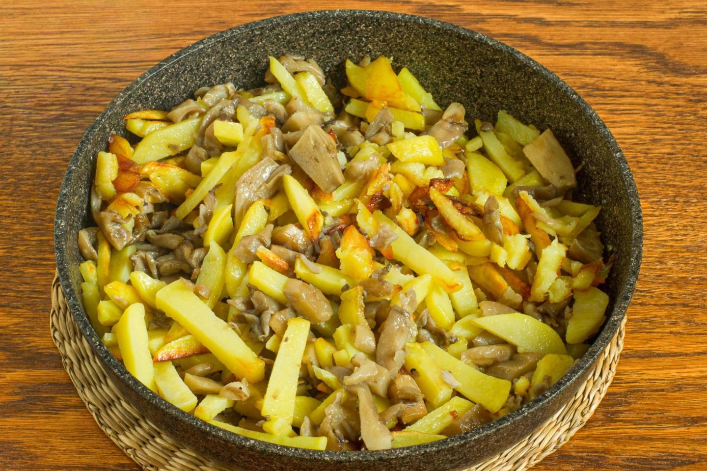 Соедините обжаренные вешенки и картофель, посолите, посыпьте черным молотым перцем и перемешайте. Подавайте блюдо сразу же после приготовления, чтобы картошка осталась хрустящей. Можете посыпать его зеленью.