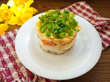 Приготовила салат нежный с курицей и сыром. Хороший рецепт, простой и быстрый, из обычных продуктов. Заранее отварила морковь, яйца и куриные бедра. Всё остудила, почистила и сняла куриное мясо с костей. Измельчила все ингредиенты, яйца не разделяла на желтки и белки. Майонез взяла 67% и смешала с чесноком. Выложила салат порционно в кольца, перемазывая соусом, получилось две хороших порции. Верхний слой сделала из зелёного лука. Салат прописался в холодильнике и после подала к столу. Получился невероятно вкусный салат. Морковка не только придала красоты, но и ярко выраженного овощного вкуса. Яйца дали нежности и воздушности салату, а курица и сыр - сытности. Отлично сыграл чеснок в соусе и придал особой изюминки салату. Красивый, яркий и нежный вышел салатик по этому рецепту. Очень вкусно, всем советую попробовать мясной салат хоть на праздник, хоть в будний день. Большое спасибо автору 😊