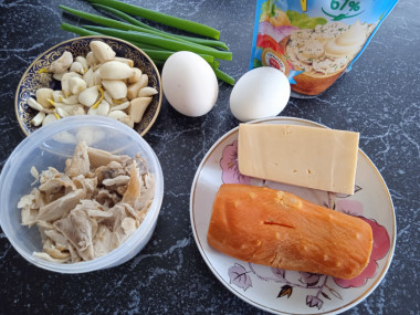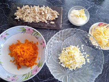 Как сделать салат Нежный с курицей и сыром? Подготовьте продукты. Куриную грудку, яйца и морковь заранее отварите и остудите. Сыр лучше возьмите с нейтральным вкусом, полумягкий или твёрдый, натуральный, без растительных добавок. Майонез для салата можно сделать самостоятельно. Под шагами вы найдете ссылку на каталог рецептов домашнего майонеза.