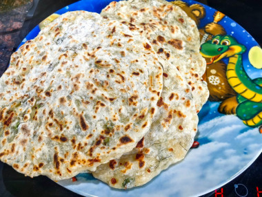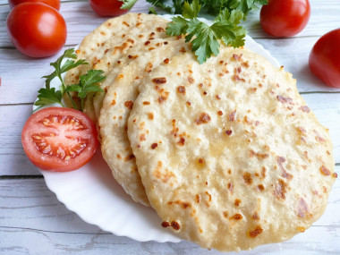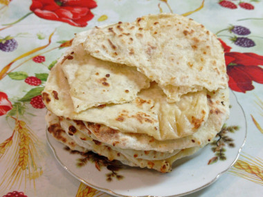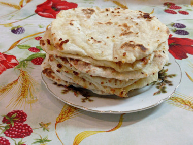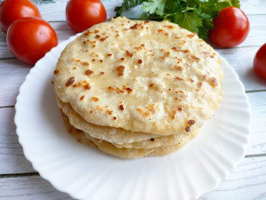 Тесто разделила на 13 частей по 50-55 граммов. Лепёшки получились диаметром примерно 12,5 см. Обжаривала их на сковороде по одной минуте с каждой стороны.