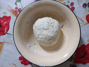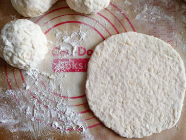 Готовое тесто разделите на несколько равных частей. Каждую часть скатайте в колобок, затем раскатайте на доске в лепёшку. Колобки хорошо раскатываются в лепёшки с мукой и без муки на столе.