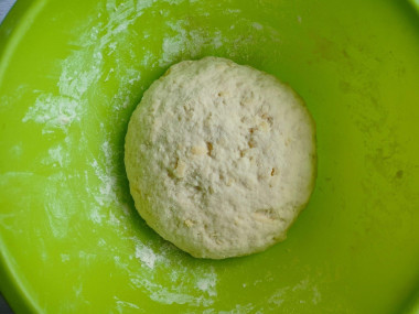 Частями добавьте в миску просеянную муку и каждый раз перемешивайте.Муки может потребоваться больше или меньше от указанного количества. Это зависит от свойств и качества муки. Поэтому при замесе ориентируйтесь на консистенцию теста. Замесите густое эластичное тесто и соберите его в шар. По консистенции такое тесто получается очень мягким, нежным и липковатым.
