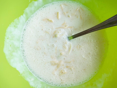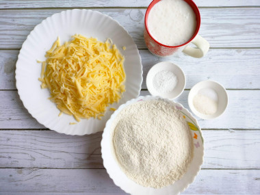 Кефир я заменила таким же количеством молока, сквашенного неполной столовой ложкой уксуса. У меня оставалось несколько сырных кусочков в холодильнике, их и использовала. Получилось около 150 граммов натертого сыра.