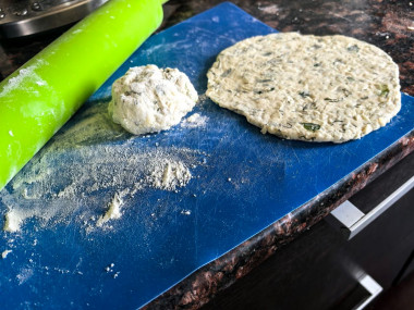 Приготовила к чаю сырные лепёшки на сковороде по этому рецепту. Кефир взяла 3,2%, комнатной температуры. Сыр у меня тильзитер. Муки ушло 400 грамм. Из указанного количества ингредиентов получилось 6 лепёшек диаметром 17,5 сантиметров. Обжаривала лепёшки на сухой чугунной сковороде