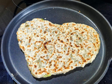 Сковороду с антипригарным покрытием (не знаю, будут ли они готовиться на обычной сковороде, не пробовала) разогрейте на сильном огне, затем огонь убавьте. Выложите лепёшку на сухую сковороду и обжаривайте с каждой стороны по минут пять с закрытой крышкой на среднем огне. Время будет зависеть от толщины самих изделий, чем толще, тем больше может потребоваться времени на их приготовление.