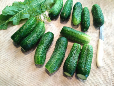 Как заготовить свежие огурцы на зиму в банках? Подготовьте необходимые ингредиенты. Огурцы (лучше выбирайте свежие и молодые) переберите, удалите порченные плоды и тщательно промойте их под проточной водой. Положите огурцы в глубокую емкость, залейте холодной водой и оставьте их вымачиваться на 4 часа. Благодаря этому огурцы получатся хрустящими. Через указанное время промойте их еще раз и дайте воде стечь с них. Срежьте у огурцов кончики с обеих сторон.