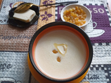 На завтрак сварила густую манную кашу на молоке. В холодное молоко высыпала манную крупу, присолила, количество сахара уменьшила вдвое ( ориентируйтесь на свой вкус). Варила при постоянном помешивании до закипания и ещё дополнительно 2-3 минуты . Пока накрывала стол, каша настаивалась под крышкой. Получилась она не слишком густая, как раз, как мне нравится, нежная, однородная без комочков. При подаче добавила немного сливочного масла и промытый изюм. Вкусно, аппетитно! Спасибо, Юлия М!