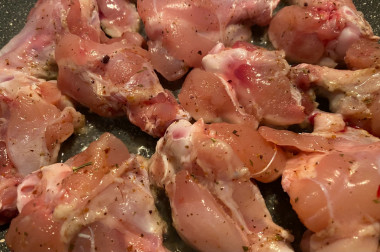 Затем переверните бедра, сделайте тише огонь и жарьте курицу на другой стороне в течение 10-15 минут.