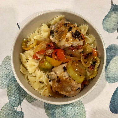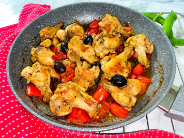 Долго искала по сайту рецепт Куриные бедра на сковороде , где будет курочка и перчик, но всё-таки нашла. Вместо бедрышек я взяла мясистую часть крылышек, два красных и 3 маленьких зеленых перца, чтобы придать яркость блюду.