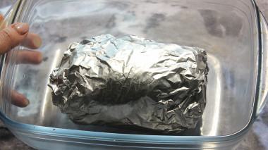 Говядину тщательно заверните в двойной лист фольги и положите на противень или в форму для запекания.
