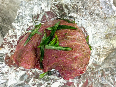 Приготовила говядину в фольге, запеченную куском в духовке, на ужин. Кусок мяса взяла весом 500 граммов. Орегано и мяты у меня не было, заменила их свежим эстрагоном. Мариновала мясо около 2,5 часов в холодильнике. Предварительно обжаривать говядину я не стала, сразу отправила его в духовку запекаться. Запекалось мясо 1 час 40 минут.