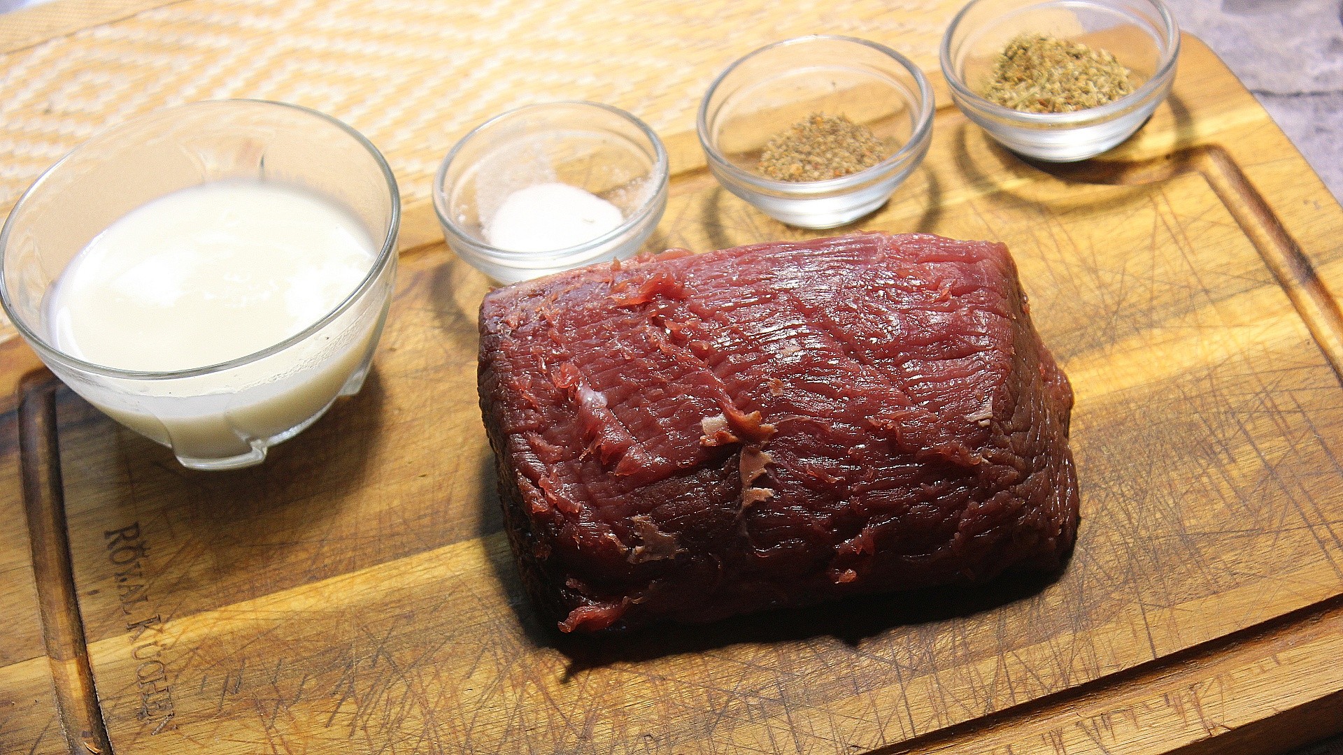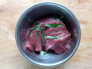 Мякоть говядины промойте, обсушите. Натрите мясо оливковым маслом, сушеными травами, солью и перцем. Оставьте мариноваться на 2 часа в холодильнике.