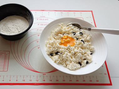 В миску выложите творожную массу и изюм. Можно добавить и сахар, если творожная масса не очень сладкая. Я не добавляла, чтобы не пересластить сырники.