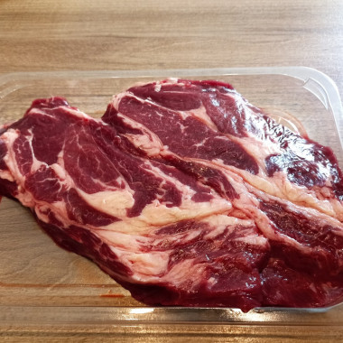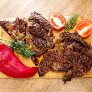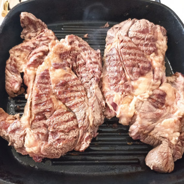 Простой и, на мой взгляд, правильный рецепт приготовления мраморной говядины на сковороде. У меня чак ролл стейк, я его не отбивала, потому что это и так мягкое и сочное говяжье мясо шейной части туши. Жарила на раскаленной сковороде гриль по 2 минуты с каждой стороны, далее всё, как советует автор. Подавала со свежими овощами и зеленью. Это восхитительное мясо! По другому тут и не скажешь. Очень понравился совет смазать кусочки готового мяса сливочным маслом, оно невероятно обогатило вкус готовых говяжьих стейков. Рекомендую этот замечательный рецепт, огромное спасибо автору за труд и советы!