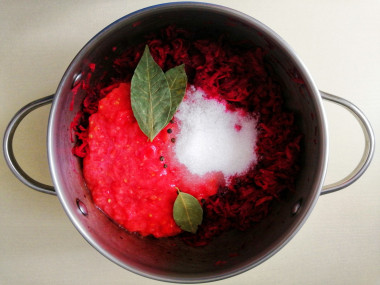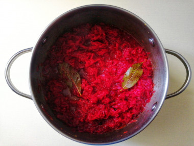 Свеклу и морковь натерла на крупной тёрке, лук нарезала кубиками. Тушила овощи с растительным маслом и одной третью уксуса, пока не выделился сок. Добавив воды, тушила еще 15 минут. После этого положила перемолотые в блендере помидоры, сахар, соль, лавровый лист, перец горошком. Оставила на медленном огне на полчаса, в конце (за пять минут до конца тушения) добавила оставшийся уксус.