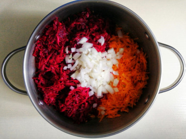 Приготовленные овощи переложите в кастрюлю, добавьте растительное масло и третью часть уксуса (уксус нужно добавить, чтобы свекла сохранила цвет во время тушения), перемешайте и поставьте кастрюлю с овощами на огонь. Когда они пустят сок, влейте воду, перемешайте. Тушите около 15 минут на среднем огне, периодически перемешивая, чтобы овощи не пригорели ко дну и не испортили вкус заготовки.