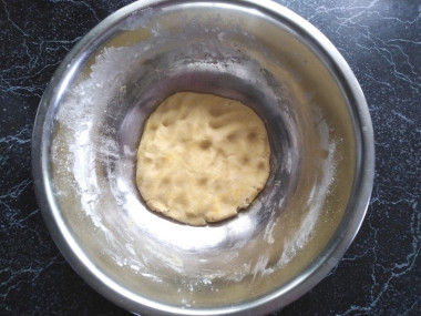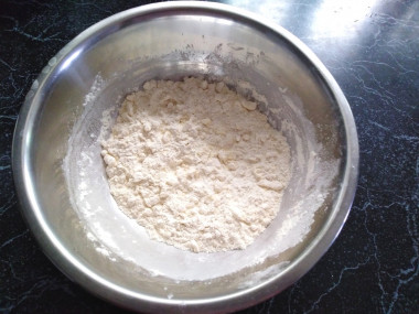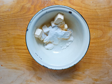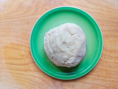 Тесто замешивала из расчета на 200 гр маргарина (6 порций). Маргарин у меня жирностью 82 процента. Воду заранее поставила ненадолго в морозилку, чтобы он была холодная. Сахарную пудру сделала самостоятельно в кофемолке. Муки (высшего сорта) у меня ушло около 340 гр. Тесто мягкое, нежное. Отправила его в морозилку на 30 минут.
