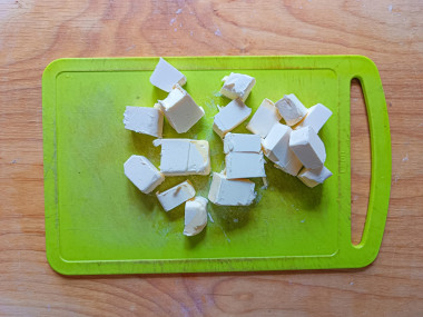 Маргарин достаньте из холодильника и нарежьте на кусочки. Оставьте при комнатной температуре, чтобы он стал более податливым.