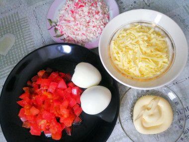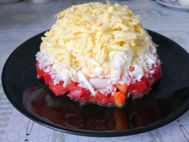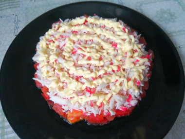 Подготовила продукты, а потом просто выкладывала на тарелку помидоры, натёртые на тёрке крабовые палочки, яйца, сыр. Промазывала слои майонезом. Самый верхний слой (сыр), промазывать не стала, чтобы сохранить нарядный внешний вид.