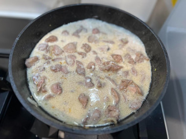Затем я добавила сметану, разведённую водой, и тушила ещё пару минут. В итоге получилась невероятно вкусная печень! Она была нежной, ароматной и просто таяла во рту. Спасибо автору за рецепт!