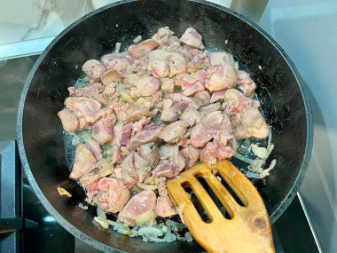 Так как мои дети не очень любят лук, я нарезала его как можно мельче. Затем обжарила его на растительном масле до золотистого цвета, добавила нарезанную печень и всё вместе обжаривала ещё 3 минуты. Важно не пережарить печень, чтобы она не стала жёсткой. Для этого нужно следить за её цветом и не передерживать на сковороде.