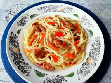 Времени на готовку у меня было немного, пришлось делать все быстро, поэтому, вместо тридцатиминутного маринования свинины в соевом соусе, добавила его к мясу в сковороду. От себя добавила нарезанный лук, обжаривала его вместе с мясом. Отдельно обжарила морковь, добавила к ней болгарский перец, затем жареное мясо. Потомила всё немного на сковороде и соединила с отваренными спагетти.