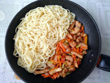 Лапшу выложите на сковороду, перемешайте с мясом и овощами. Прогрейте на медленном огне 1-2 минуты и подавайте.