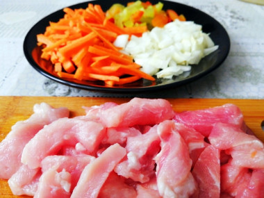 Мясо помойте, хорошо обсушите. Нарежьте мясо средними брусочками.