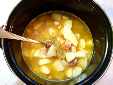 Добавьте в кастрюлю картофель. Всыпьте хмели-сунели, соль и перец, добавьте лавровый лист.