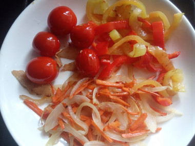 Снимите помидоры со сковороды и положите к остальным обжаренным овощам.
