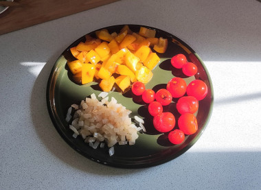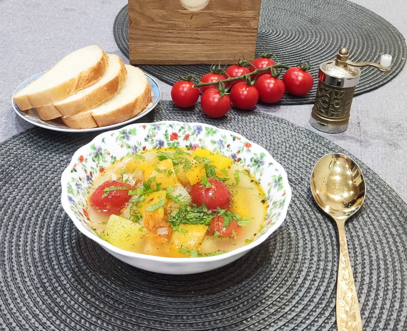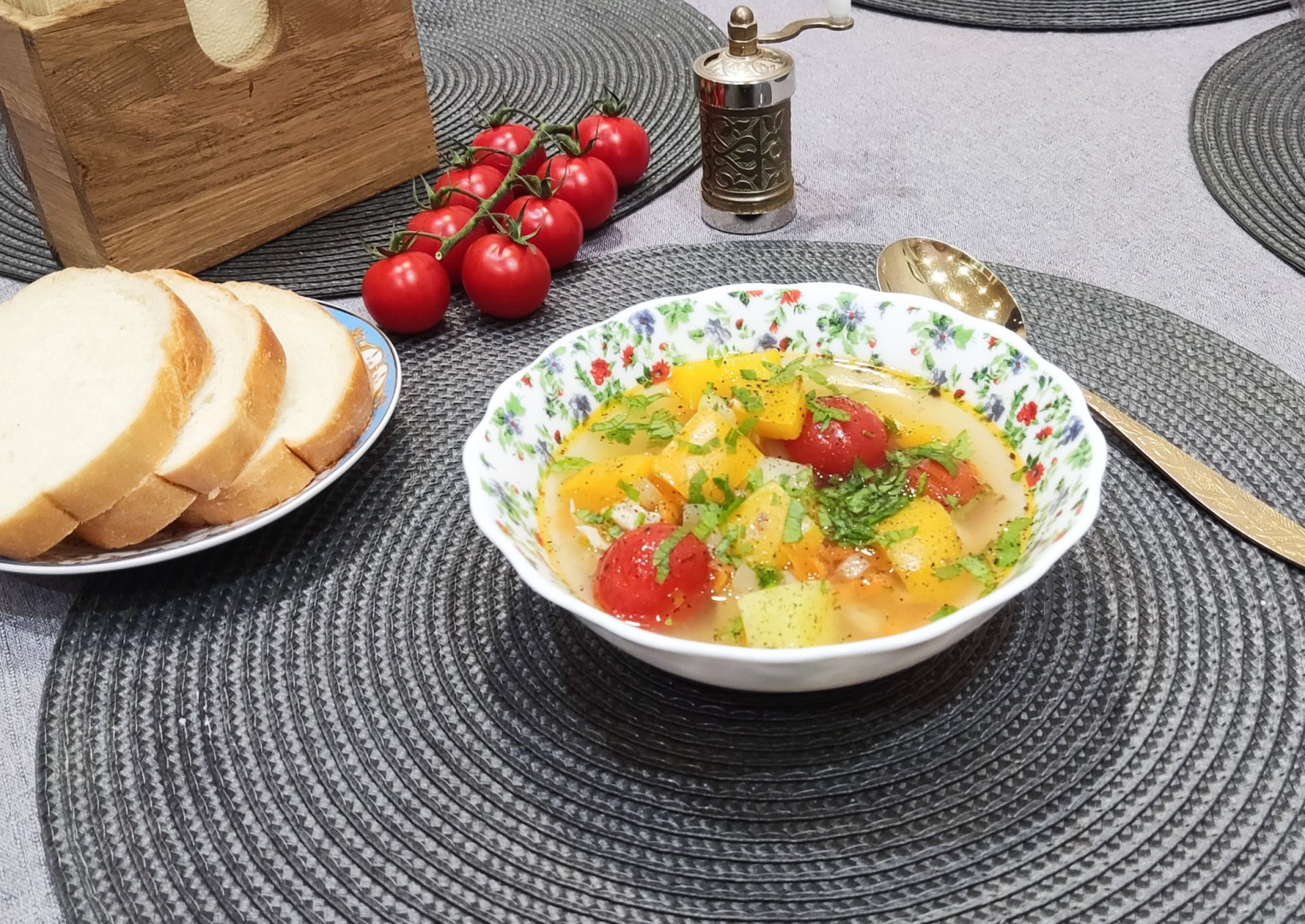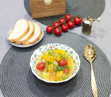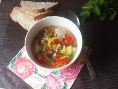 Я варила суп на свином наваристом бульоне, поэтому он получился достаточно жирный. Помидоров черри у меня не было, вместо них добавила обычные, порезав их на квадратики. И перцы были только красные. С перцами разных цветов суп, конечно, получился бы красочнее.