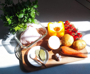 Как сварить суп с болгарским перцем? Подготовьте необходимые ингредиенты. Для супа можно использовать филе грудки или индюшатину. Перец лучше взять разных цветов, тогда суп будет выглядеть ярче и аппетитнее. Из зелени подойдут зелёный лук, петрушка и укроп. Перец и помидоры помойте. Морковь, картошку и чеснок также помойте и почистите.